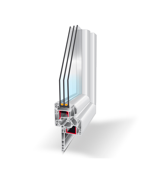 Perfiles de PVC con triple junta (mediante junta rígida en el marco). Protegiendo de esta manera todos los puntos de cierre y proporcionando una junta perimetral completa, con espesores en perfil de 3mm. • Refuerzo de Acero: Éste con tratamiento antioxidante en todos los perfiles. Posibilidad de perfiles de refuerzo con rotura de puente térmico que consiguen un mayor aislamiento sin perder la resistencia del acero. • Sección de Hoja 80mm: Esta profundidad permite la ubicación de 6 cámaras de aislamiento, integrándose en un marco de renovación con una profundidad de 55mm y una solapa de 64mm. • Sistema de Foliado Total: Marca la diferencia con otros sistemas de ventana, obteniendo una estética en acabados de color, con alta resistencia y mayor durabilidad al paso del tiempo.
